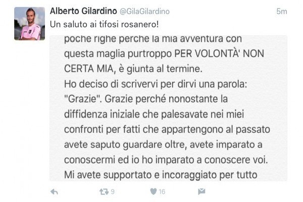 Alberto Gilardino dice addio ai tifosi del Palermo. Attraverso il proprio profilo Twitter, l'attaccante biellese ha salutato il suo vecchio...