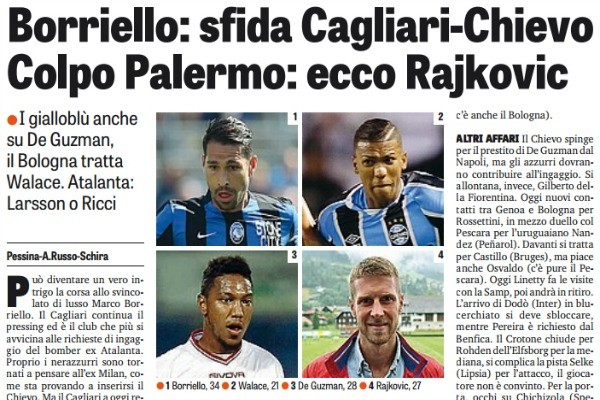 Gazzetta dello Sport: “Per Borriello è sfida Cagliari-Chievo. Colpo Palermo: ecco Rajkovic. Il Bologna tratta Walace, l’Atalanta Larsson e Ricci” – tutte le trattative di oggi