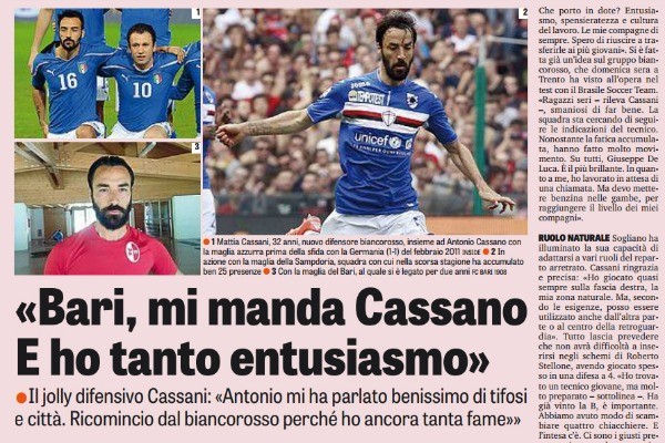 Gazzetta dello Sport, ex rosa: “«Bari, mi manda Cassano e ho tanto entusiasmo». Il jolly difensivo Cassani: «Ricomincio dal biancorosso perché ho ancora tanta fame»”
