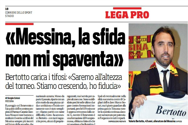 Corriere dello Sport: “«Messina, la sfida non mi spaventa». Bertotto carica i tifosi: «Saremo all’altezza del torneo. Stiamo crescendo, ho fiducia»”