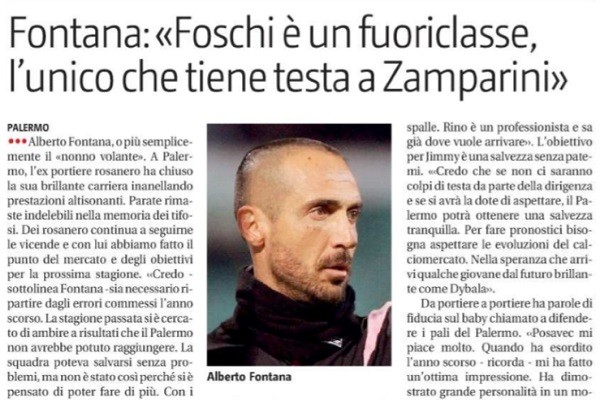 Intervenuto ai microfoni de “Il Giornale di Sicilia” l’ex rosanero Alberto Fontana si è così espresso su Rino Foschi: «A...