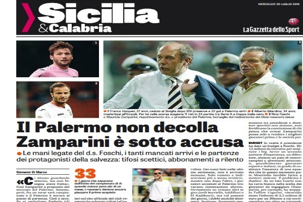 Gazzetta dello Sport: “Il Palermo non decolla, Zamparini è sotto accusa. I tanti mancati arrivi e le partenze dei protagonisti della salvezza: tifosi scettici, abbonamenti a rilento”