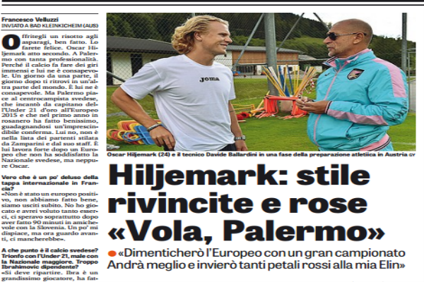 Intervistato da "La Gazzetta dello Sport", il centrocampista rosanero, Oscar Hiljemark ha parlato della prossima stagione: «Preoccupato? No, spero solo sia...
