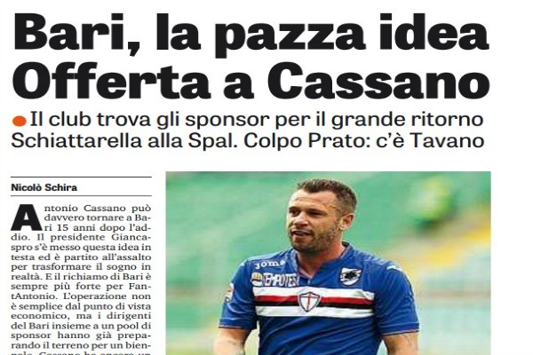 "Antonio Cassano può davvero tornare a Bari 15 anni dopo l’addio. Il presidente Giancaspro s’è messo questa idea in testa...