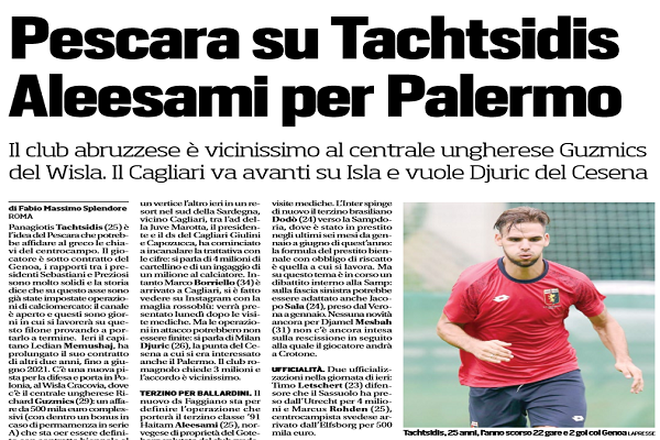 "Panagiotis Tachtsidis (25) è l’idea del Pescara che potrebbe affidare al greco le chiavi del centrocampo. Il giocatore è sotto...