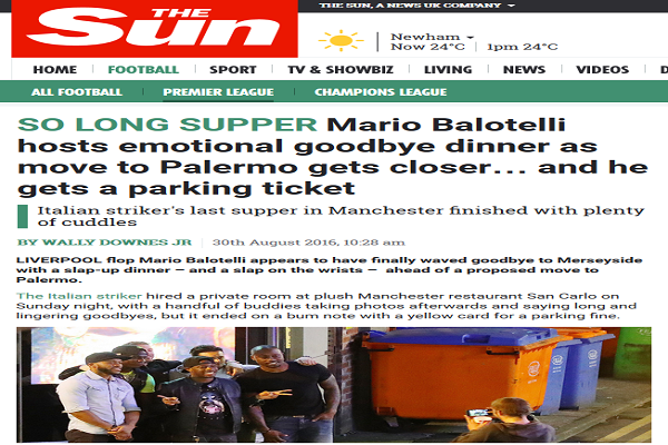 "Mario Balotelli saluta il Liverpool con una cena d'addio, passaggio al Palermo vicino", questo quanto titola oggi il "The Sun"....