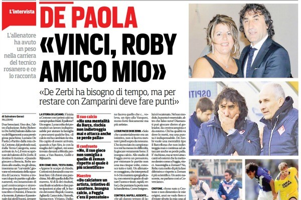 Corriere dello Sport: “De Paola: «Vinci, Roby amico mio. De Zerbi ha bisogno di tempo, ma per restare con Zamparini deve fare punti»”