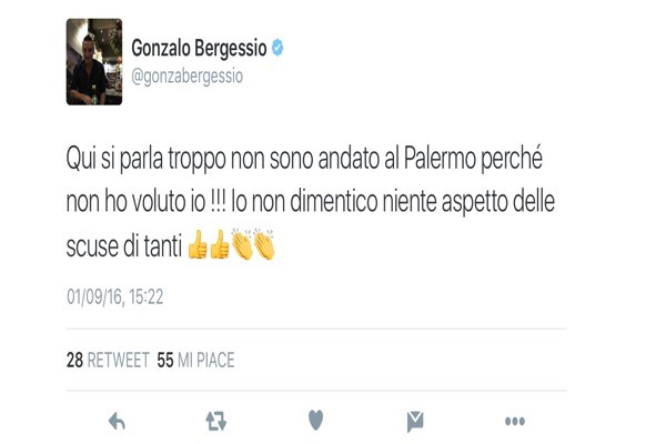Twitter Bergessio: “Ho rifiutato Palermo per mia scelta, ora aspetto le scuse di tanti” (FOTO)