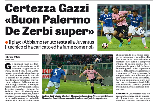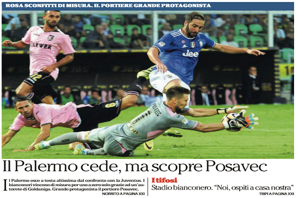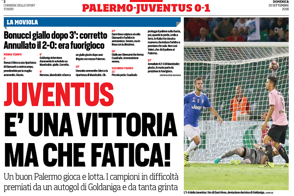 Corriere dello Sport: “Juventus, è una vittoria ma che fatica! Un buon Palermo gioca e lotta. I campioni in difficoltà premiati da un autogol di Goldaniga”