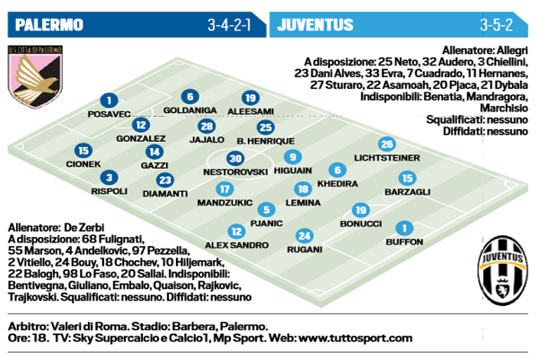 Tuttosport: “La giocheranno così: Khedira s’inserisce per “bucare” Aleesami. Bacconi anticipa Palermo-Juventus di oggi pomeriggio: il duello chiave si gioca in fascia”