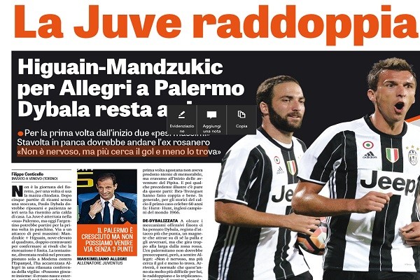 Gazzetta dello Sport: “Higuain-Mandzukic, per Allegri a Palermo Dybala resta a riposo”