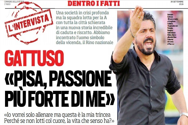 Corriere dello Sport, ex rosa: “Gattuso: «Pisa, passione più forte di me. Io vorrei solo allenare ma questa è la mia trincea. Perché se non lotti col cuore, la vita che senso ha?»