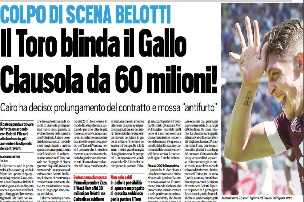 Tuttosport: “Colpo di scena Belotti. Il Toro blinda il Gallo: clausola da 60 milioni!”