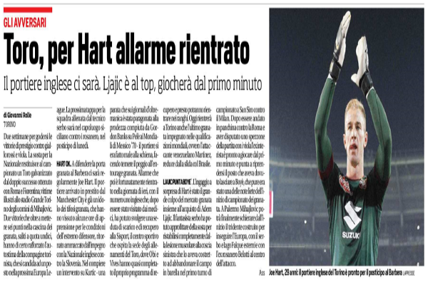"A difendere la porta granata al Barbera ci sarà regolarmente Joe Hart. Il portiere arrivato in prestito dal Manchester City...