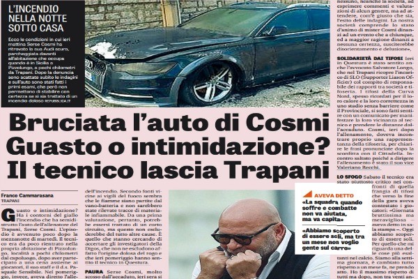 "Serse Cosmi ha lasciato Trapani dopo che la notte precedente un incendio ne ha semidistrutto la sua auto, una Audi...