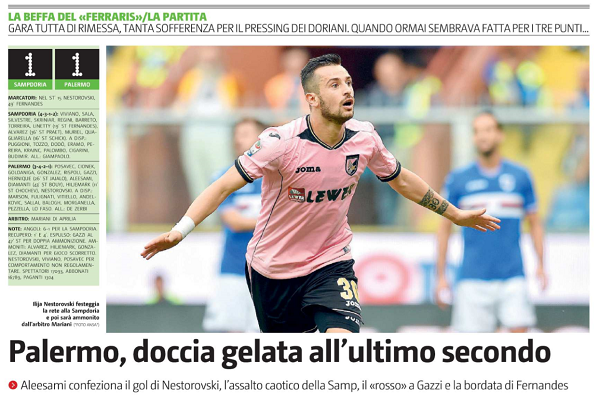 "Doccia gelata. All'ultimo secondo dell'ultimo minuto dei quattro concessi da Mariani il Palermo è stato raggiunto dalla Sampdoria con un...