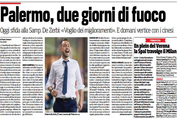 Tuttosport: “Le probabili formazioni di Sampdoria-Palermo. De Zerbi conferma il 3-4-2-1
