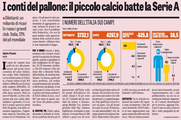 Gazzetta dello Sport: “I conti del pallone: il piccolo calcio batte la serie A. Dilettanti: un miliardo di ricavi. In rosso i grandi club. Italia, 12% del pil mondiale”