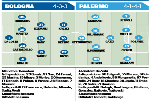 L'edizione odierna di "Tuttosport" ha stilato le probabili formazioni di Bologna-Palermo, gara in programmadomenica alle 15. In alto le potenziali...