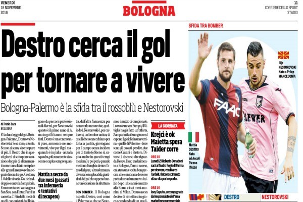Corriere dello Sport: “Destro cerca il gol per tornare a vivere, Bologna-Palermo è la sfida tra il rossoblù e Nestorovski”