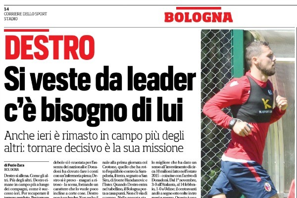 Corriere dello Sport: “Bologna, Destro si veste da leader. C’è bisogno di lui”