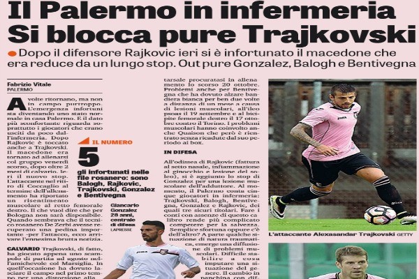 Gazzetta dello Sport: “Il Palermo in infermeria. Si blocca pure Trajkovski, ancora out Gonzalez, Balogh e Bentivegna”