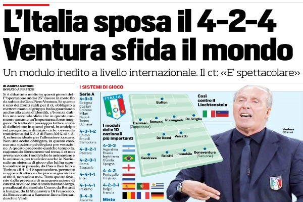 Corriere dello Sport: “Nazionale: l’Italia sposa il 4-2-4, Ventura sfida il mondo”