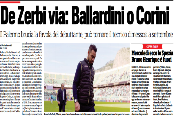 Corriere dello Sport: “Al Barbera i fischi solo in chiusura in uno stadio semideserto. E intanto la Curva Nord si divide su Zamparini “