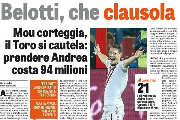"Andrea Belotti ha sorpassato Higuain. Non è uno slogan, ma il prezzo fissato da Urbano Cairo per la clausola di...