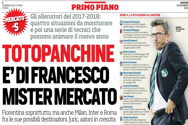 Queste le prime pagine dei principali quotidiani sportivi nazionali di oggi, giovedì 29 dicembre 2016.