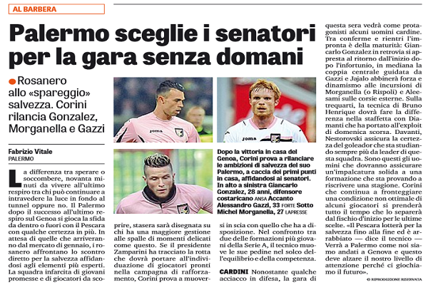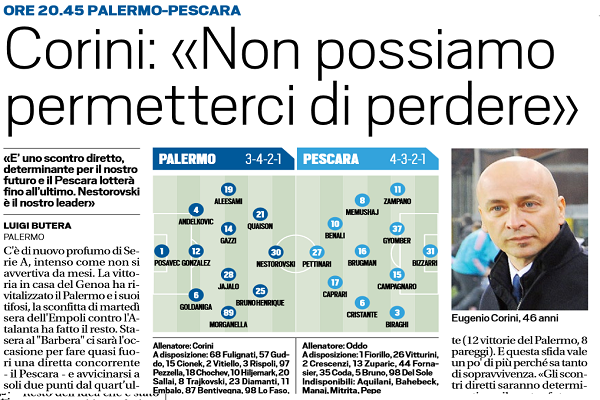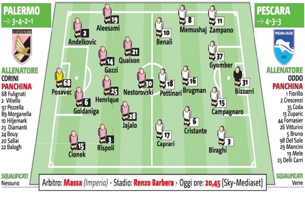 L'edizione odierna de "La Gazzetta dello Sport" ha stilato le probabili formazioni di Palermo-Pescara, gara valida per la 18^ giornata...