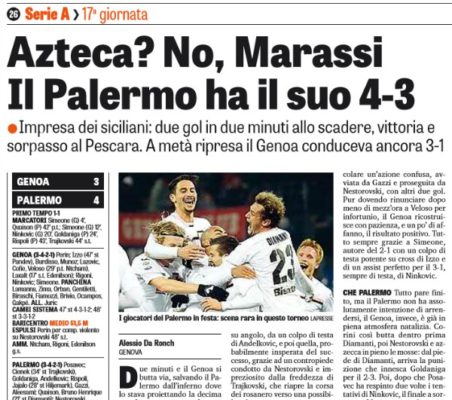 L'edizione odierna de "La Gazzetta dello Sport" ha stilato le pagelle di Genoa-Palermo, vinta dai rosa per 3-4. Di seguito...
