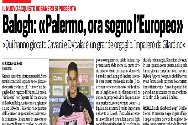 Corriere dello Sport: “Ecco Balogh: «Palermo, ora sogno l’Europeo»”