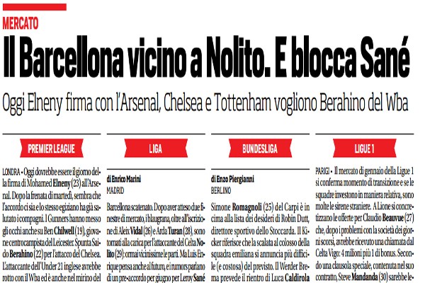 Corriere dello Sport: “Il Barcellona vicino a Nolito – ecco tutti gli affari dei campionati europei”
