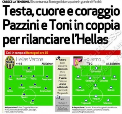 L'edizione odierna de "L'Arena di Verona" parla del match di oggi contro il Palermo e della probabile formazione di Delneri:...