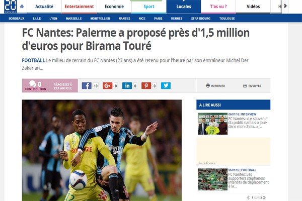 Secondo quanto riportato da un quotidiano francese il Palermo avrebbe offerto 1,5 milioni al Nantes per Birama Tourè, centrocampista classe...