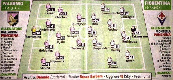 Secondo le probabili formazioni stilate dall'edizione odierna de "Il Giornale di Sicilia" Ballardini questo pomeriggio al "Barbera" contro la Fiorentina...