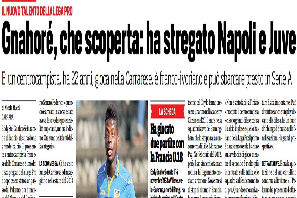 "Eddy Stel Gnahoré è in rampa di lancio, destinazione grande calcio. Il possente centrocampista francese della Carrarese è uno dei...