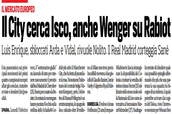 Mercato Europa: Il City cerca Isco, anche Wenger su Rabiot