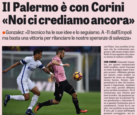 Gazzetta dello Sport: “Il Palermo è con Corini. Gonzalez: «Il tecnico ha le sue idee e lo seguiamo. A -11 dall’Empoli ma basta una vittoria per rilanciare le nostre speranze di salvezza»”