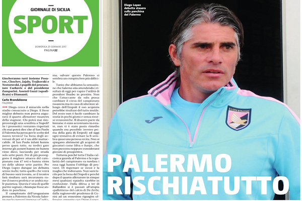 "Diego cerca il miracolo nello stadio consacrato a Diego. E forse miglior debutto non poteva augurarsi il quarto allenatore rosanero...
