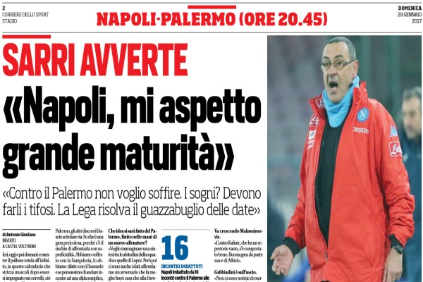 Corriere dello Sport: “Quanti dubbi per Sarri e Lopez. Le probabili formazioni di Napoli-Palermo” (FOTO)