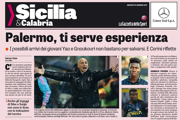Gazzetta dello Sport: “Tiepida fiducia a Palermo. E ora è Corini che ha i dubbi”