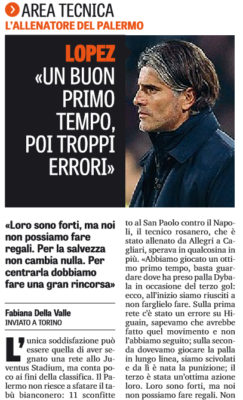 L'edizione odierna de "La Gazzetta dello Sport" ha stilato le pagelle di Juventus-Palermo, match perso ieri dagli uomini di Lopez....