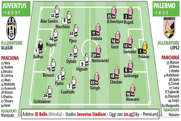 L'edizione odierna de "Il Giornale di Sicilia2 ha stilato le probabili formazioni di Juventus-Palermo, match in programma stasera. In alto...