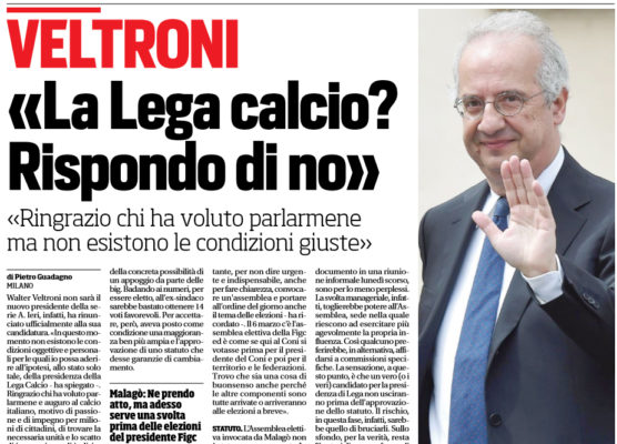 "Walter Veltroni non sarà il nuovo presidente della serie A. Ieri, infatti, ha rinunciato ufficialmente alla sua candidatura. «In questo...