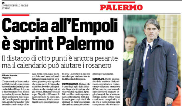 Corriere dello Sport: “Caccia all’Empoli, è sprint Palermo. Il distacco di otto punti è ancora pesante ma il calendario può aiutare i rosanero”