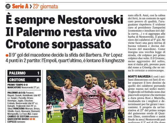 Giornale di Sicilia: “Nestorovski tiene a galla il Palermo. Crotone ko, ora si può sperare”