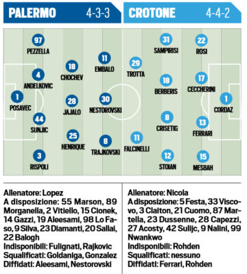 Giornale di Sicilia: “Le probabili formazioni di Palermo-Crotone. Pezzella confermato, in avanti c’è Embalo” (FOTO)