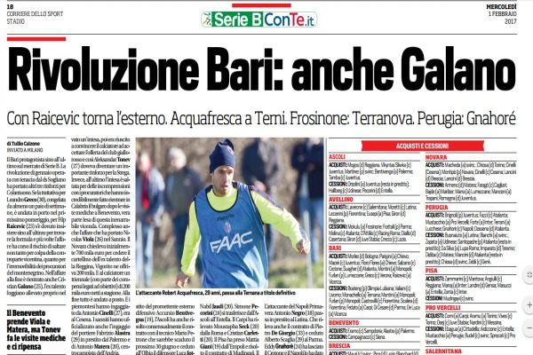 Corriere dello Sport: “Tutti gli affari conclusi in B. Rivoluzione Bari: anche Galano. Con Raicevic torna l’esterno. Acquafresca a Terni. Frosinone: Terranova”